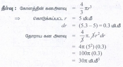 10. ஒரு வட்ட வடிவத் தகடு வெப்பத்தினால் சீராக விரிவடைகின்றது என்க. அதன் ஆரம் 10.5 செமீ-இலிருந்து 10.75 செ.மீ-ஆக அதிகரிக்கும்போது அதன் பரப்பில் ஏற்படும் தோராய அதிகரிப்பு மற்றும் தோராய சதவீத அதிகரிப்பு ஆகியவற்றைக் காண்க