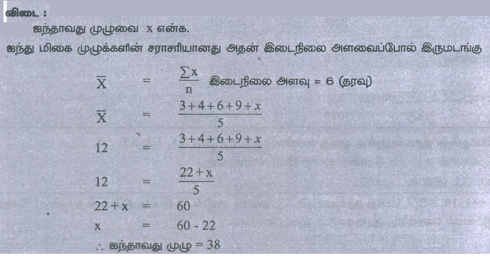 6. ஐந்து மிகைமுழுக்களின் சராசரியானது அதன் இடைநிலை அளவைப்போல் இருமடங்கு. அதில் நான்கு முழுக்கள் 3, 4, 6, 9 மற்றும் அதன் இடைநிலை அளவு 6 எனில் ஐந்தாவது முழுவைக் காண்க.