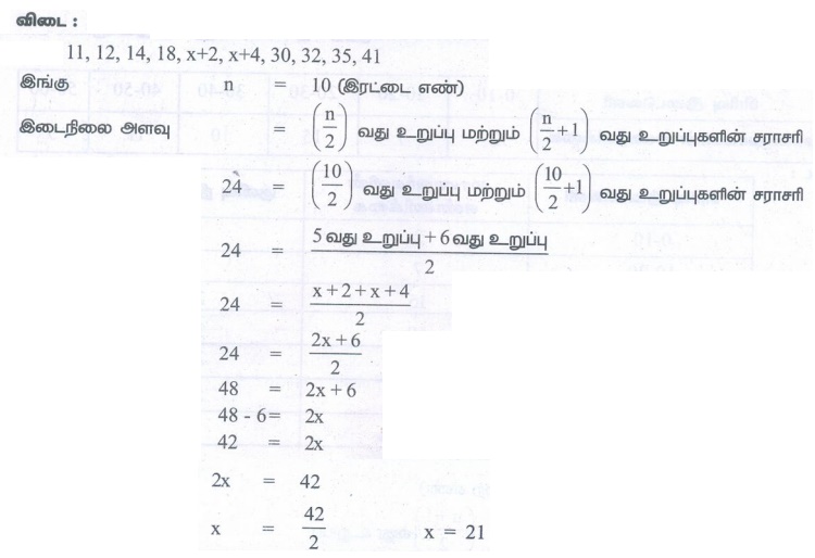 x+2, x+4, 30, 32, 35, 41 என்ற தரவுகளின் இடைநிலை அளவு 24 எனில் x