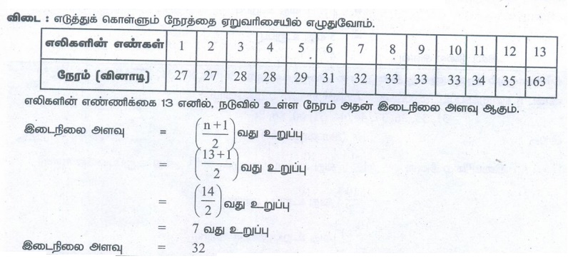 31,33,63,33,28,29,33,27,27,34,35,28,32 எனப் பட்டியலிட்டுள்ளார். எலிகள் உணவு தேட எடுத்துக்கொள்ளும் நேரத்தின் இடைநிலை அளவு காண்க.