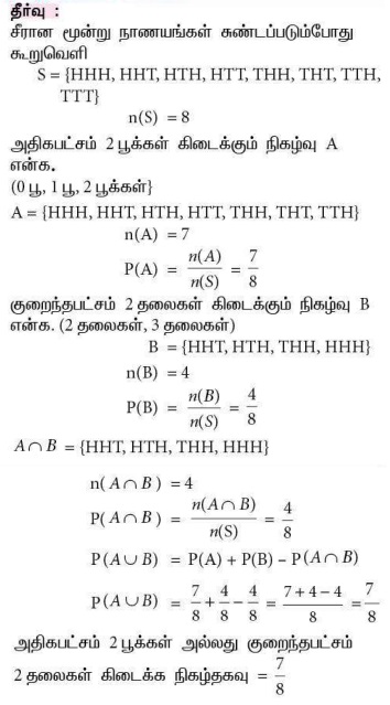 9. சீரான மூன்று நாணயங்கள் ஒரு முறை சுண்டப்படுகின்றன. அதிகபட்சம் 2 பூக்கள் அல்லது குறைந்தபட்சம் 2 தலைகள் கிடைப்பதற்கான நிகழ்தகவைக் காண்க.