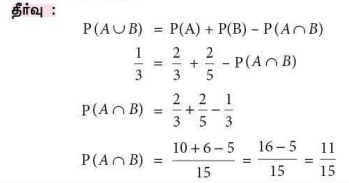 1. P (A) = 2/3, P (B) = 2/5, P (A ∪ B) = 1/3 எனில், P (A Ո B) காண்க.