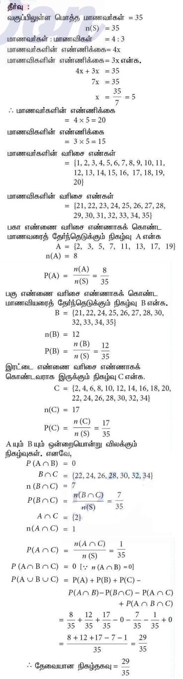 14. 35 மாணவர்கள் உள்ள ஒரு வகுப்பில் ஒவ்வொருவருக்கும் 1 முதல் 35 வரை எண்கள் கொடுக்கப்பட்டுள்ளன. மாணவர்களுக்கும் மாணவிகளுக்கும் உள்ள விகிதமானது 4:3 ஆகும். வரிசை எண்கள் மாணவர்களில் தொடங்கி மாணவிகளில் முடிவடைகிறது. ஒருவர் வகுப்பிலிருந்து தேர்ந்தெடுக்கப்படுகிறார். அவர் பகா எண்ணை வரிசை எண்ணாகக் கொண்ட மாணவராகவோ அல்லது பகு எண்ணை வரிசை எண்ணாகக் கொண்ட மாணவியாகவோ அல்லது இரட்டை எண்ணை வரிசை எண்ணாகக் கொண்டவராகவோ இருப்பதற்கான நிகழ்தகவைக் காண்க.