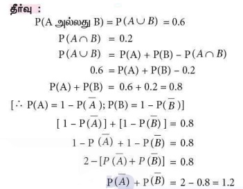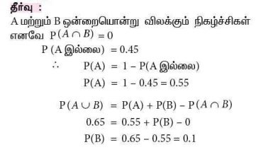 3. ஒரு சமவாய்ப்புச் சோதனையில் A, B ஆகியவை ஒன்றையொன்று விலக்கும் நிகழ்ச்சிகள். மேலும் P(Aஇல்லை) = 0.45, P (A U B) = 0.65 எனில், P (B) -ஐக் காண்க.