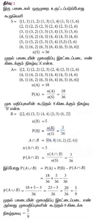 6. இரண்டு பகடைகள் ஒரு முறை உருட்டப்படுகின்றன. முதல் பகடையில் முக மதிப்பு இரட்டைப் படை எண் அல்லது முக மதிப்புகளின் கூடுதல் 8 ஆகக் கிடைப்பதற்கான நிகழ்தகவைக் காண்க.