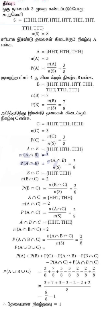 12. ஒரு நாணயம் மூன்று முறை சுண்டப்படுகிறது. சரியாக இரண்டு தலைகள் அல்லது குறைந்தபட்சம் ஒரு பூ அல்லது அடுத்தடுத்து இரண்டு தலைகள் கிடைப்பதற்கான நிகழ்தகவைக் காண்க.