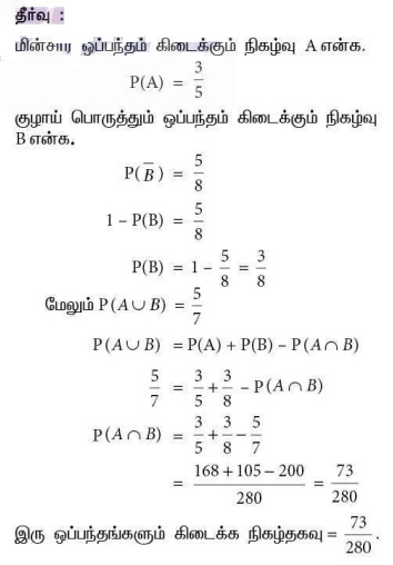 10. ஒருவருக்கு மின்சார ஒப்பந்தம் கிடைப்பதற்கான நிகழ்தகவு 3/5 மற்றும் குழாய்கள் பொருத்துவதற்கான ஒப்பந்தம் கிடைக்காமல் இருப்பதற்கான நிகழ்தகவு 5/8 ஆகும். மேலும் குறைந்தபட்சம் ஏதாவது ஒரு ஒப்பந்தம் கிடைக்கப்பெறுவதற்கான நிகழ்தகவு 5/7 எனில், இரண்டு ஒப்பந்தங்களும் கிடைப்பதற்கான நிகழ்தகவு என்ன?