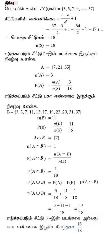 8. ஒரு பெட்டியில் 3, 5, 7, 9, ... 35, 37 என்ற எண்கள் குறிக்கப்பட்ட சீட்டுகள் உள்ளன. சமவாய்ப்பு முறையில் எடுக்கப்படும் ஒரு சீட்டு ஆனது 7-ன் மடங்காக அல்லது பகா எண்ணாக இருப்பதற்கான நிகழ்தகவைக் காண்க.