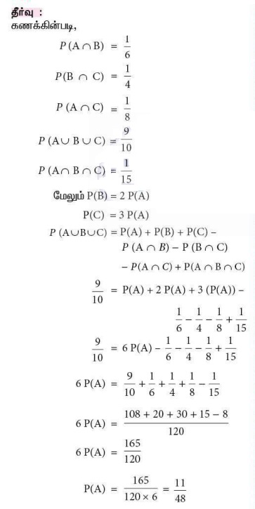 13. A, B, C என்பன ஏதேனும் மூன்று நிகழ்ச்சிகள். மேலும் B கிடைப்பதற்கான நிகழ்தகவு A -ன் நிகழ்தகவைப் போல இருமடங்காகவும், C கிடைப்பதற்கான நிகழ்தகவு A -ஐ விட மூன்று மடங்காகவும் உள்ளன. மேலும் P (A ∩ B) = 1/6. P (B ∩ C) = 1/4, P (A ∩ C) = 1/8, P (A ∪ B ∪C) = 9/10, P (A ∩ B ∩C) = 1/15, எனில், P (A), P (B) மற்றும் P (C) -ஐக் காண்க?