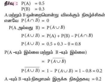 5. நிகழ்ச்சி A -க்கான நிகழ்தகவு 0.5 மற்றும் B -க்கான நிகழ்தகவு 0.3. A மற்றும் B ஆகியவை ஒன்றையொன்று விலக்கும் நிகழ்ச்சிகள் எனில், A -ம், B -ம் நிகழாமல் இருப்பதற்கான நிகழ்தகவைக் காண்க.