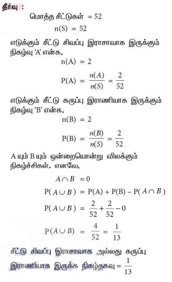 7. நன்கு கலைத்து அடுக்கிய 52 சீட்டுகளைக் கொண்ட கட்டிலிருந்து, சமவாய்ப்பு முறையில் ஒரு சீட்டு எடுக்கப்படுகிறது. அது சிவப்பு இராசாவாக அல்லது கருப்பு இராணியாக இருப்பதற்கான நிகழ்தகவைக் காண்க
