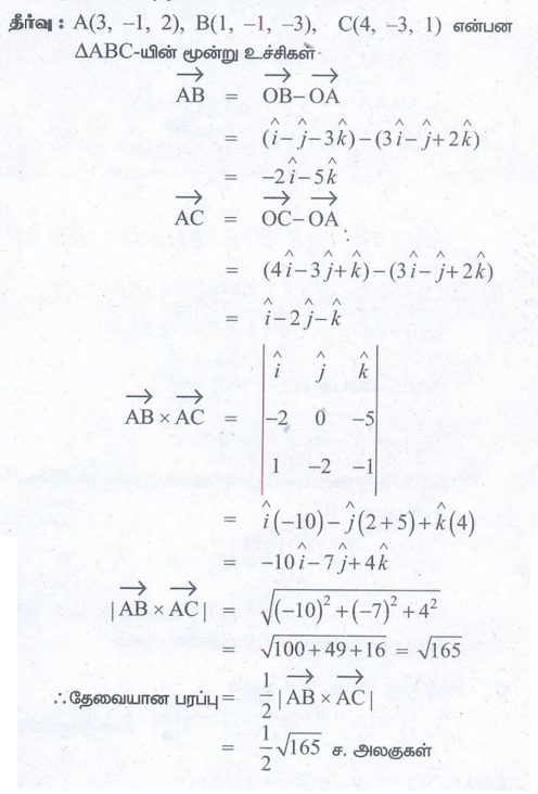 (6) A(3, – 1, 2), B(1, – 1, – 3) மற்றும் C(4, – 3, 1) ஆகியவற்றை உச்சிப்புள்ளிகளாகக் கொண்ட முக்கோணத்தின் பரப்பளவைக் காண்க.