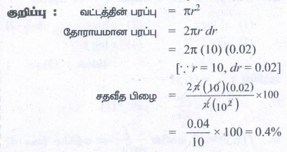 1. ஒரு வட்ட வடிவ வார்ப்பின் ஆரம் 10 செமீ. ஆரத்தின் அளவில் தோராயமாக 0.02 செமீ பிழை உள்ளது எனில் அதன் பரப்பில் ஏற்படும் தோராய சதவீதப் பிழையைக் காண்க.