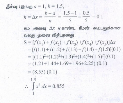 2. {1.1, 1.2, 1.3, 1.4, 1.5} எனும் பிரிவினையுடன் வலது-முனை விதியைப் பயன்படுத்தி 1.5∫1 x2dx -க்கு தோராய மதிப்பு காண்க.