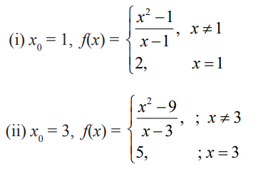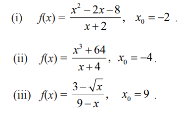 (11) பின்வரும் சார்புகளில் எவற்றுக்கு x = x0 −ல் நீக்கக்கூடிய தொடர்ச்சியற்ற தன்மை உள்ளது எனக் காண்க? தொடர்ச்சியற்ற தன்மை இருக்குமானால், f −ன் x ≠ x0 −க்கு ஏற்றவாறு ℝ −இல் தொடர்ச்சியாக இருக்குமாறு g என்ற சார்பைக் காண்க.