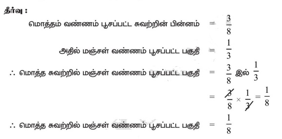 பகுதியை வண்ணம் பூசினார். அதில் மூன்றில் ஒரு பங்கு மஞ்சள் நிற வண்ணம் பூசினார் எனில், மொத்தச் சுவற்றில் மஞ்சள் நிறம் பூசப்பட்ட பகுதியின் பின்னம் என்ன?