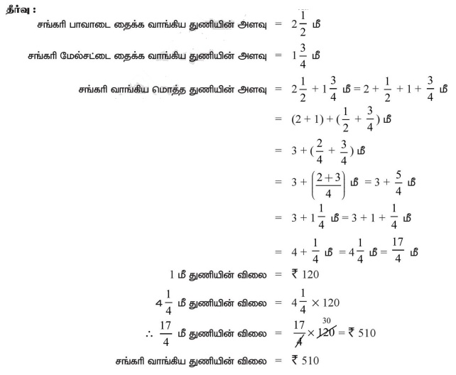 1. சங்கரி 2½ மீ துணியை முழுப் பாவாடை தைக்கவும் மற்றும் 1¾ மீ துணியை மேல் சட்டை தைக்கவும் வாங்கினார். ஒரு மீட்டர் துணியின் விலை ₹120 எனில் அவர் வாங்கிய துணியின் விலை என்ன?