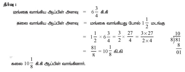4. மங்கை 6 ¾ கி.கி எடையுள்ள ஆப்பிள்கள் வாங்கினார். கலை, மங்கை வாங்கியது போல் 1½ மடங்கு ஆப்பிள்களை வாங்கினார் எனில், கலை எவ்வளவு கிலோ கிராம் ஆப்பிள்களை வாங்கினார்?