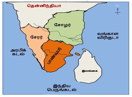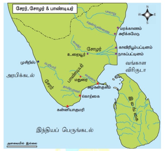 ஆறுகள் வரைபடத்தில் சேர, சோழ, பாண்டிய அரசுகளின் எல்லைகளைக் குறித்து, வர்ணம் தீட்டவும்.
