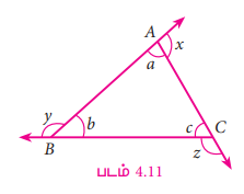 ∆ABC இல் A, B மற்றும் C இல் அமையும் கோணங்களை முறையே a, b மற்றும் C எனவும், A, B மற்றும் C இல் அமையும் வெளிக்கோணங்களை x, y மற்றும் z எனவும் எடுத்துக்கொள்வோம்.