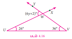 படம் 4.16 இல் கொடுக்கப்பட்டுள்ள விவரங்களிலிருந்து ∠UWY இன் மதிப்பைக் காண்க. ∠XWV பற்றி நீங்கள் என்ன கருதுகிறீர்கள்?