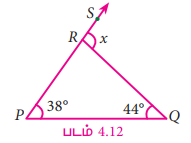 ∆PQR, R இல் அமையும் ∠SRQ என்ற வெளிக்கோணத்தைக் கண்டுபிடி.