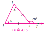 படத்தில் கொடுக்கப்பட்டுள்ள இருசமபக்க முக்கோணம் ∆IJK இல் ∠IKL =128° எனில், x இன் மதிப்பைக் காண்க.