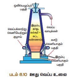3. ஊது உலையில் உருக்கிப்பிரித்தல்: வறுக்கப்பட்ட தாது, கல்கரி, சுண்ணாம்புக்கல் இவற்றை 8:4:1 என்ற விகிதத்தில்