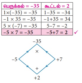 பெருக்குத் தொகை = a × c = 7 × ( –5) = –35 கூடுதல் b= 2