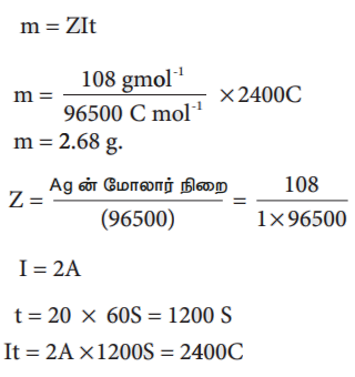 2 ஆம்பியர் மின்னோட்டத்தைக் கொண்டு, சில்வர் நைட்ரேட் கரைசலானது 20 நிமிடங்களுக்கு மின்னாற்பகுக்கப்படுகிறது எனில், எதிர்மின்முனையில் வீழ்படிவாகும் சில்வரின் நிறையை கணக்கிடுக.