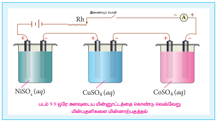 படம் 9.9ல் காட்டியுள்ளவாறு ஒரே DC மின்மூலத்துடன் தொடர் இணைப்பில் இணைக்கப்பட்டுள்ள மூன்று மின்னாற்பகுப்புக் கலன்களை கருதுவோம். ஒவ்வொரு மின்கலமும் வெவ்வேறு மின்பகுளிகளை முறையே NiSO4 CuSO4 மற்றும் CoSO4 கரைசல்களைக் கொண்டு நிரப்பப்பட்டுள்ளன.