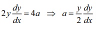 சமன்பாட்டின் இருபக்கமும் x ஐப் பொருத்து வகைக்கெழு காண, நாம் பெறுவது 2y dy/dx = 4 a ⇒ a = y/2 dy/dx