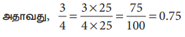 அதாவது, 3/4 = 3×25/4×25 = 75/100 = 0.75 (ஏனெனில் 4 ஆல் பெருக்கினால் 10 வருமாறு முழு எண் இல்லை)