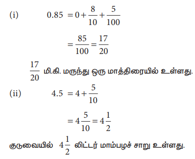 (i) ஒரு மாத்திரையானது 0.85 மி.கி. மருந்தைக் கொண்டுள்ளது. (ii) ஒரு குடுவையில் மாம்பழச் சாறு 4.5 லிட்டராக உள்ளது. இவற்றைப் பின்னத்தில் குறிப்பிடுக.