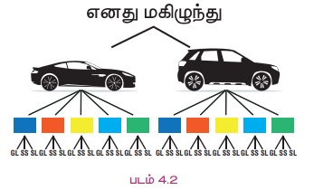 எடுத்துக்காட்டு 4.5 ஒரு நபர் ஒரு மகிழுந்து வாங்க விரும்புகிறார், சந்தையில் இரண்டு வகையான வியாபார முத்திரை மகிழுந்துகள் உள்ளன. மேலும் ஒவ்வொரு வியாபார முத்திரை மகிழுந்திலும் 3 வெவ்வேறு வகைகள் உள்ளன. மேலும் இந்த ஒவ்வொரு வகையிலும் படம் 4.2 இல் உள்ளது போல் 5 வெவ்வேறு நிறங்களில் மகிழுந்துகள் வருகின்றன. எத்தனை வழிகளில் மகிழுந்துகளை அவரால் தேர்ந்தெடுக்க முடியும்?