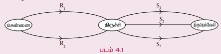 எடுத்துக்காட்டு 4.2 சென்னை, திருச்சி மற்றும் திருநெல்வேலி என்ற மூன்று நகரங்களை எடுத்துக்கொள்வோம். ஒருவர் சென்னையிலிருந்து திருச்சி வழியாகத்தான் திருநெல்வேலி செல்ல முடியும் என்க. சென்னை மற்றும் திருச்சிக்கு இடையே 2 சாலைகளும், திருச்சியிலிருந்து திருநெல்வேலி செல்ல 3 சாலைகளும் உள்ளன. சென்னையிலிருந்து திருநெல்வேலிக்கு எத்தனை வழிகளில் செல்ல முடியும்?