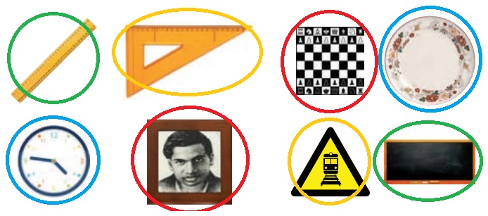 கொடுக்கப்பட்டுள்ள பொருள்களின் வடிவங்களை கண்டறிந்து, சதுரங்களை சிவப்பு நிறத்திலும் செவ்வகத்தை பச்சை நிறத்திலும் முக்கோணங்களை மஞ்சள் நிறத்திலும் வட்டங்களை நீல நிறத்திலும் வட்டமிடுக, ஒத்த வடிவங்களை உடைய பொருள்களை இணைக்கவும்.