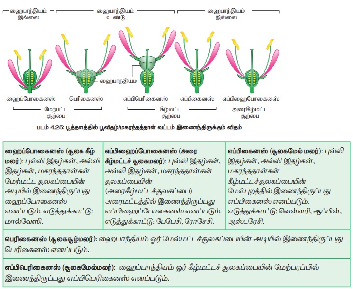பூத்தளத்தில் பூவிதழ் / மகரந்தத்தாள் வட்டம் இணைந்திருக்கும் விதம்: