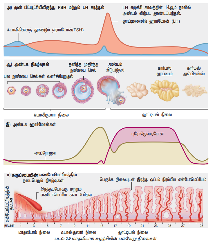 31. மாதவிடாய் சுழற்சியின் பல்வேறு நிலைகளை விளக்குக.