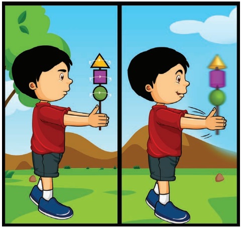 முக்கோணம், செவ்வகம் மற்றும் வட்ட வடிவத் தாள்களை எடுத்துக்கொள்ளவும். படத்தில் காட்டியவாறு குச்சியில் ஒட்டவும். பின் குச்சியை வேகமாகப் படத்தில் காட்டியவாறு சுழற்றவும். இருபரிமாண வடிவங்களிலிருந்து உருவாகும் முப்பரிமாண உருவங்களை உற்று நோக்குக.