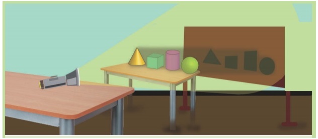 படத்தில் உள்ளவாறு பொருள்களை மேசை மீது வைக்கவும். அவற்றின் பின்புறம் அட்டைப் பலகையைப் பொருத்தவும். பிறகு கை விளக்கைக் கொண்டு கிடைமட்டமாகப் பொருள்களின் முன் பக்கமிருந்து ஒளியைப் பாய்ச்சவும். மாணவர்களை அட்டைப் பலகையில் விழும் பொருள்களின் நிழல்களை உற்று நோக்கச் செய்யவும்.