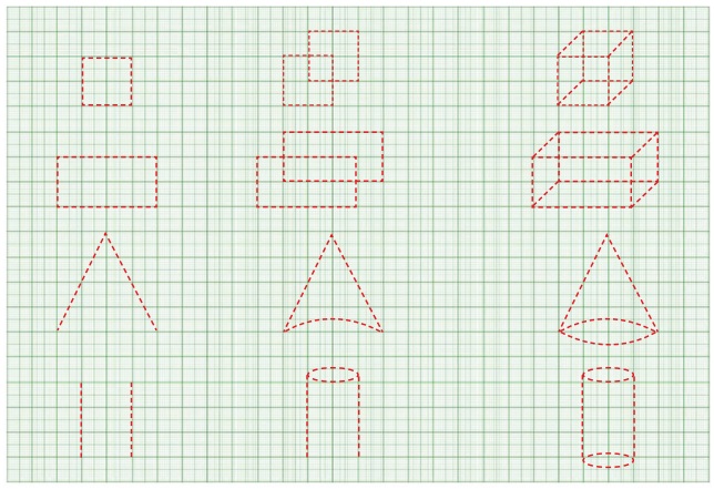 இணைத்து கனச்சதுரம், கனச்செவ்வகம், கூம்பு மற்றும் உருளை ஆகியவற்றை வரைந்து மகிழ்க.