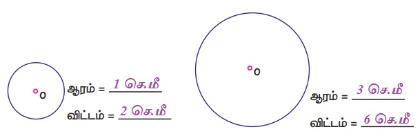 கீழே கொடுக்கப்பட்டுள்ள வட்டத்தின் ஆரம் மற்றும் விட்டத்தினை அளந்து எழுதுக.