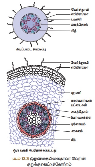 ரைசோடெர்மிஸ்: ஒரு விதையிலைத் தாவர வேரின் வெளிப்புற அடுக்கு மெல்லிய சுவருடைய