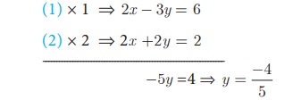 தீர்க்க 2x − 3y = 6, x + y = 1