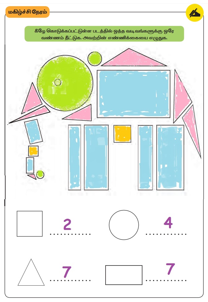 கீழே கொடுக்கப்பட்டுள்ள படத்தில் ஒத்த வடிவங்களுக்கு ஒரே வண்ணம் தீட்டுக. அவற்றின் எண்ணிக்கையை எழுதுக.