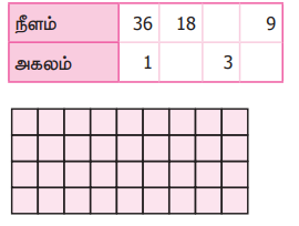 கீழ்க்கண்ட அட்டவணையை நிறைவு செய்து பரப்பளவு 36 ச.செ.மீ உள்ளவாறு அனைத்துச் செவ்வகங்களையும் உருவாக்குக.
