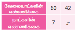 60 வேலையாட்கள் ஒரு பருத்தி நூல் உருண்டையை நூற்க 7 நாட்கள் தேவைப்படுகிறது. 42 வேலையாட்கள் அதே வேலையைச் செய்து முடிக்க எத்தனை நாட்கள் ஆகும்?