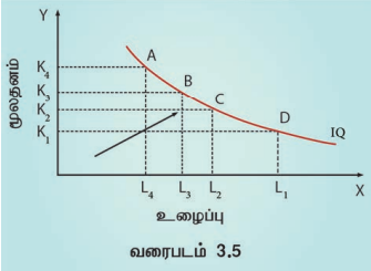 வரைபடத்த்தில் A -என்னும் இணைப்பில் K5 அளவு அதிக மூலதனத்தையும் L2 - குறைந்த உழைப்பையும் கொண்டு உற்பத்தி செய்யப்படுகிறது. B, C மற்றும் D - ஆகிய இணைப்பிற்கு உற்பத்தியாளர் இடம்பெயரும்போது அதிக அளவு உழைப்பும், குறைந்த அளவு மூலதனமும் பயன்படுத்தப்படுகின்றன.