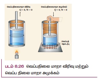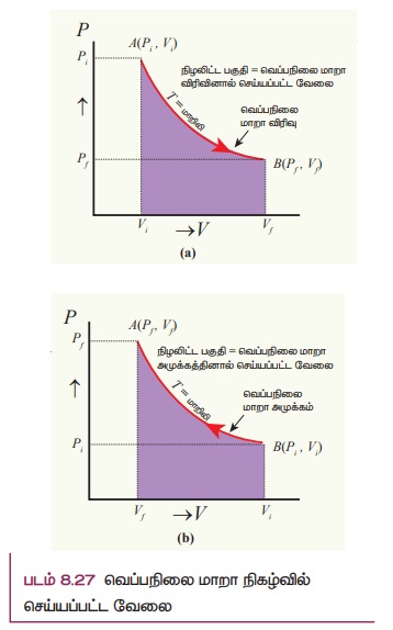 எனவே, வெப்பநிலை மாறா அமுக்கத்தில் வாயுவின்மீது செய்யப்பட்ட வேலை எதிர்க்குறி ஆகும். PV வரைபடத்தில், வெப்பநிலைமாறா விரிவின் போது வாயுவால் செய்யப்பட்ட வேலை வரைபடத்திற்குக் கீழே உள்ள பரப்பிற்குச் சமம் என்பது படம் 8.27(a) இல் காட்டப்பட்டுள்ளது.